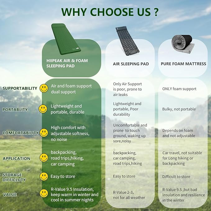 • Experience revolutionary comfort with the HiiPeak Memory Foam Sleeping Pad!: Say goodbye to sore mornings, HiiPeak Foam Sleeping Mattress is engineered with innovative Hi-Tech Memory Foam for unmatched comfort and support,which perfectly distributes weight and relieves pressure at every contact point. No more tossing and turning! The unique surface air cells design fits your back and waist with targeted ergonomic support, Breathable and sweat redcuing in summer night , super comfortable. This innovative design combines cloud-like softness with body-contouring stability, ensuring deep, restorative sleep whether you’re in a tent or under the stars.