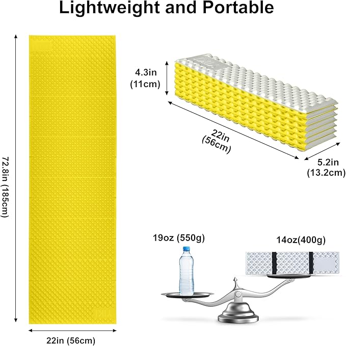 • Suitable Size and Multi-Purpose Outdoor Gear: The unfolded size of the foam sleeping pad is 72.8 x 22 inches, and the folded size is 22 x 5.2 x 4.3 inches, easy to fold & carry. And more than just a camping pad! Use it as a picnic mat, temporary seat, yoga pad, or protective ground cover under air mattresses. Whether you’re resting during a trek, or simply enjoying the outdoors, YIKI adds versatility to your gear setup