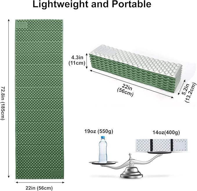 • Suitable Size and Multi-Purpose Outdoor Gear: The unfolded size of the foam sleeping pad is 72.8 x 22 inches, and the folded size is 22 x 5.2 x 4.3 inches, easy to fold & carry. And more than just a camping pad! Use it as a picnic mat, temporary seat, yoga pad, or protective ground cover under air mattresses. Whether you’re resting during a trek, or simply enjoying the outdoors, YIKI adds versatility to your gear setup