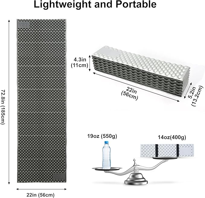 • Suitable Size and Multi-Purpose Outdoor Gear: The unfolded size of the foam sleeping pad is 72.8 x 22 inches, and the folded size is 22 x 5.2 x 4.3 inches, easy to fold & carry. And more than just a camping pad! Use it as a picnic mat, temporary seat, yoga pad, or protective ground cover under air mattresses. Whether you’re resting during a trek, or simply enjoying the outdoors, YIKI adds versatility to your gear setup