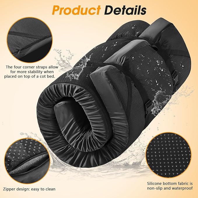 • CONVENIENT TO CARRY WITH WATERPROOF AND NON-SLIP BOTTOM: The portable mattress comes with amazing straps to secure the mattress to camping beds, beds, sofas and other places of use, the straps ensure that the mattress stays in place and doesn't move, the rubberized dots on the bottom can firmly fit the massage bed and is not easy to move, keeping it in a fixed and comfortable position.