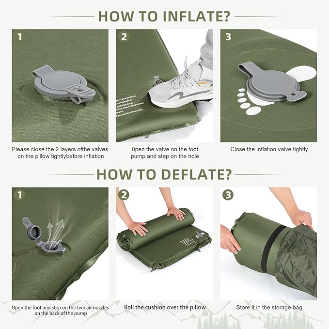 • Upgraded Valves For Easier Storage: Storage of foam sleeping mats has always been a challenge, and to make it easier, we have revolutionized the valve making it a dual-use valve. When inflating, simply open the two layers for self-inflating. When you need to deflate, OPEN ONLY THE FIRST LAYER and be sure to keep the second layer closed, in this state, air can only go out and not in, then you just need to squeeze out the air to complete the storage.