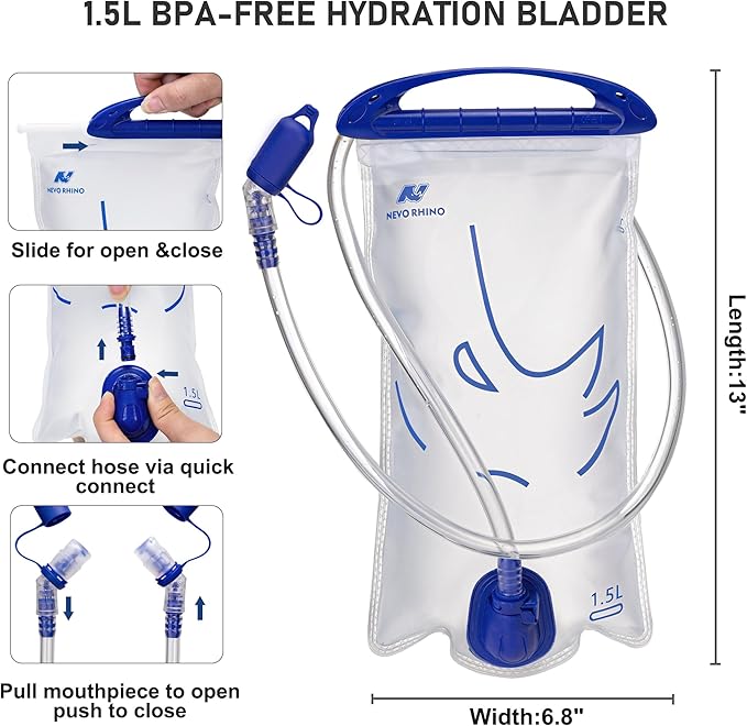 • Hydration bladder&Neck Gaiter: Hydration vest with a weight of just 130 g (4.59 oz) and a size of 13.4x 7.9 inches,Equipped with a 1.5L water bladder made from food grade material,free of BPA. The hydration bladder features pressure resistance and leak-proof,ensuring sufficient water supplw during various outdoor activities,it also come with neck gaiter (UV-protective face cover or sweatband)