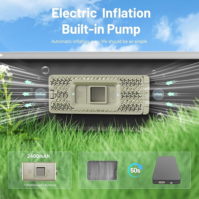 • Rechargeable and Removable Smart Charging Pump - Our portable pump features a robust 2400mAh battery capacity, delivering rapid inflation for camping mats within 50 seconds. After a full charge (3-4 hours), it supports up to 7 automatic inflation cycles. This design allows you to spend less time setting up gear and more time embracing nature's serenity
