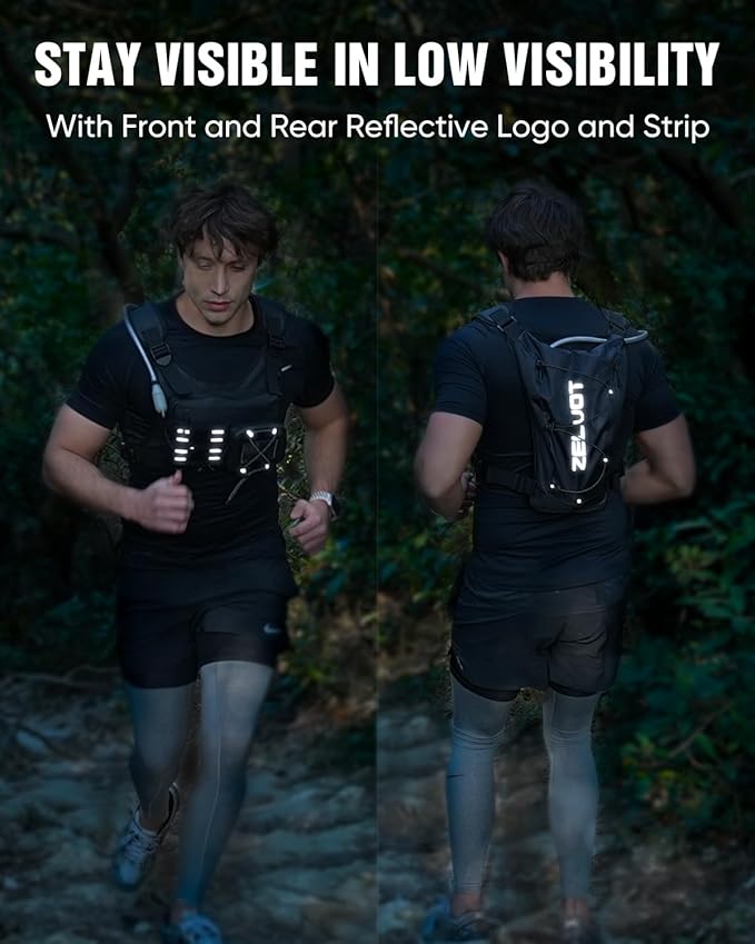 • Stay Hydrated on the Run - Zelvot running hydration vest includes a 2L water bladder made from food-grade materials, 100% BPA & PVC-free. Designed with a high-flow bite valve for hands-free drinking, it keeps you hydrated without breaking your stride. Perfect for trails, races, and long-distance runs.